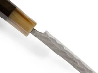 , bietet ein hervorragendes Schärfepotenzial. Der Schneidkern besteht aus Aogami Super, dem blauen Papierstahl. Der Stahl ist ein echter japanischer Kohlenstoffstahl und kann sehr hart geschmiedet werden. Er zeichnet sich durch feinstes Martensit – metastabiles Gefüge – aus, das für höhere Härte und eine ausgezeichnete Schärfe sorgt. Ein weiterer Vorzug ist, dass Aogami super trotz hoher Härte leicht geschliffen werden kann und aufgrund des hohen Anteils von Wolfram eine sehr gute Standfestigkeit zeigt. Mit diesem Schneidkern bieten die Messer dieser Serie also eine außergewöhnlich hohe Schärfe, Schneidleistung und Beständigkeit.