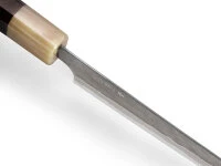 Japanische Kochmesser bestehen aus äußerst harten Stählen und sind dünner geschmiedet und geschliffen als ihre europäischen Pendants. Einige dieser Messer verfügen über sehr fein geschliffene Schneidlagen, wodurch sie empfindlicher sind und sich lediglich für weiches Schnittgut eignen. Bitte beachten Sie diesbezügliche Informationen in den Produktdetails. Insbesondere Messer mit sehr dünner Schneide und Hohlschliff neigen zu Ausbrüchen an der Klinge. Diese sind hervorragend für feine Schnitte von weichem Schnittgut geeignet, sind aber mit entsprechender Vorsicht zu verwenden. Beim Schärfen auf einem Schleifstein entsteht in der Regel ein Winkelschliff, wodurch die Schneide mit der Zeit stabiler wird.