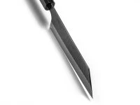 -Wert, Messgröße für die Härte des Stahls, liegt bei 61. VG-10 ist ein Edelstahl und enthält im Unterschied zu den Kohlenstoffstählen Aogami oder Shirogami ca. 15% Chrom. Die Ummantelung besteht aus 16 Lagen härterem und 18 Lagen etwas weicherem Nickel Damast, so dass Härte, Schärfe und die sinnvolle Elastizität in einem hervorragenden Verhältnis zueinanderstehen. Finish: Optisch wird die Klinge einerseits durch die Damast Lagen, andererseits – im oberen Bereich – durch das Hammering dominiert. Bevor die Klinge gehämmert wird, bearbeitet Yoshimi die Klingen-Oberfläche mit einem besonders feinen Schliff. In Test hat sich herausgestellt, dass der eckige, besondere Stil des Hammerings den Antihaft-Effekt für Schnittgut sehr gut unterstützt. Griff: Der Griff dieser Messer ist aus hochwertigem, schwarzem