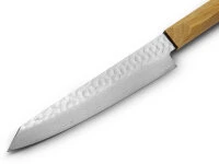 Diese Damastmesser haben eine Klinge aus dem beliebten Edelstahl VG-10 als Schneidlage, die von Damaststahl umhüllt ist. Der obere Teil der Klinge ist mit einem schönen und nützlichen Hammering ausgestattet. Im unteren Teil verlaufen die schönen Linien des Damaststahls. Die zweiseitig geschliffene Klinge – für Rechts- und Linkshänder – wurde zum Abschluss poliert. Außergewöhnlich ist der Griff aus Eichenholz, der hervorragend in der Hand liegt und zur Klinge hin leicht abgeflacht ist.