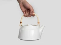 Teekanne von Tatsumi Kato (ceramic japan), traditionell von Hand gefertigt, in modernem Design. Die Manufaktur hat ihren Sitz in Seto, Präfektur Aichi. Dort, wo traditionell Töpferware hergestellt wird, da diese Region mit einem besonders hochwertigen Töpferkitt ausgestattet ist. Es ist das einzige Töpferzentrum in Japan, das eine Glasur verwendet, die seit der Kamakura-Zeit, seit über 1000 Jahre, eingesetzt wird. Die vielfach prämierte Manufaktur zeichnet sich durch ihre bewusst enge Zusammenarbeit von modernen Designern mit traditionellen Kunsthandwerkern aus. Die Ergebnisse sind Produkte, die die Welt noch nicht gesehen hat. Neue Formen von hoher Ästetik aber auch höchstem Gebrauchswert und bester Qualität. Die Unterschiede zu preiswerter Massen- und Industrieware ist nicht nur sichtbar sondern – so Tee-Kenner – auch im Geschmackserlebnis deutlich erfahrbar.