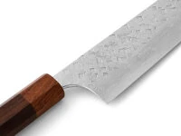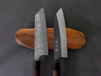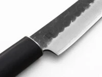 Japanische Kochmesser bestehen aus äußerst harten Stählen und sind dünner geschmiedet und geschliffen als ihre europäischen Pendants. Einige dieser Messer verfügen über sehr fein geschliffene Schneidlagen, wodurch sie empfindlicher sind und sich lediglich für weiches Schnittgut eignen. Bitte beachten Sie diesbezügliche Informationen in den Produktdetails. Insbesondere Messer mit sehr dünner Schneide und Hohlschliff neigen zu Ausbrüchen an der Klinge. Diese sind hervorragend für feine Schnitte von weichem Schnittgut geeignet, sind aber mit entsprechender Vorsicht zu verwenden. Beim Schärfen auf einem Schleifstein entsteht in der Regel ein Winkelschliff, wodurch die Schneide mit der Zeit stabiler wird.